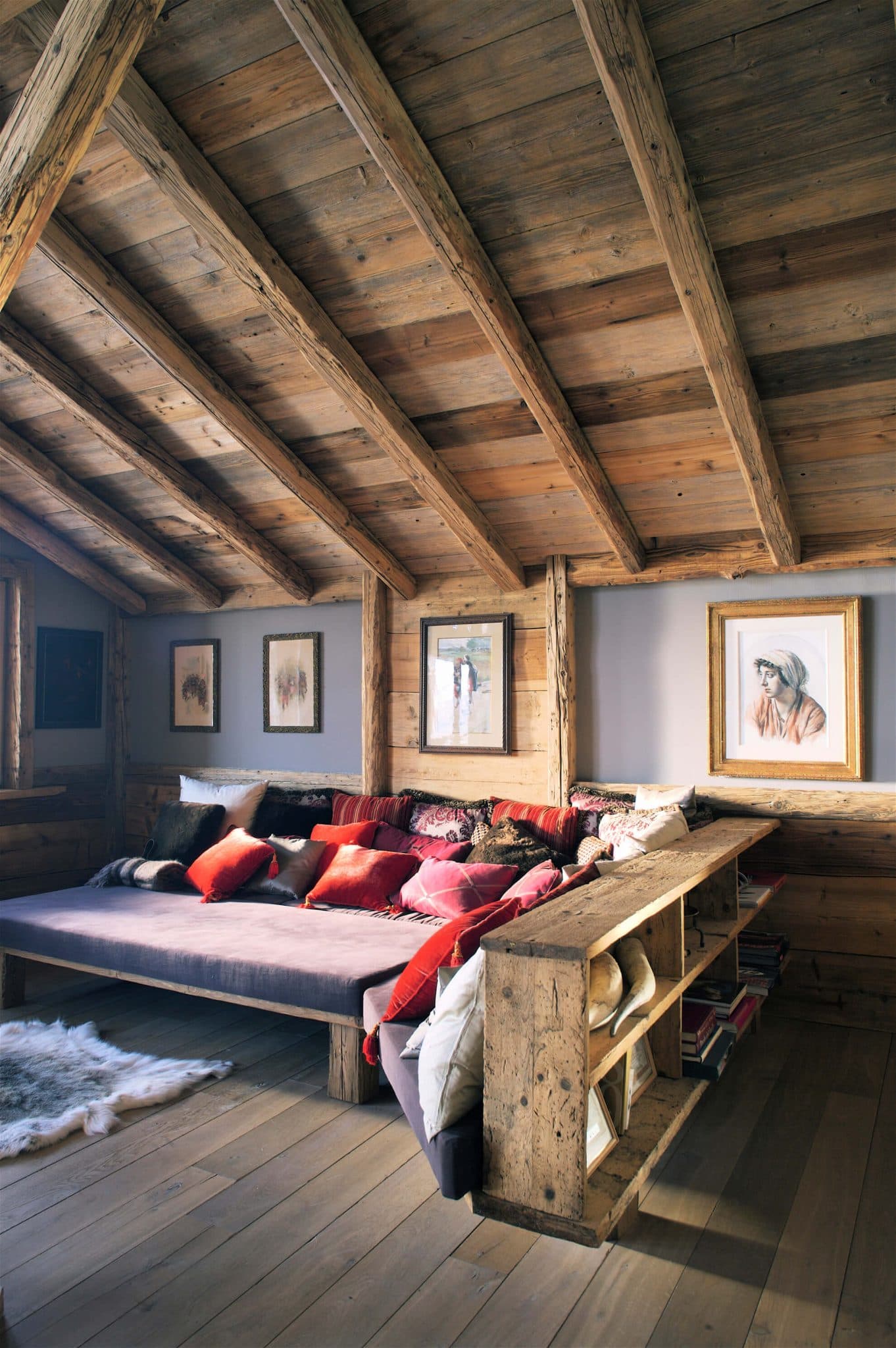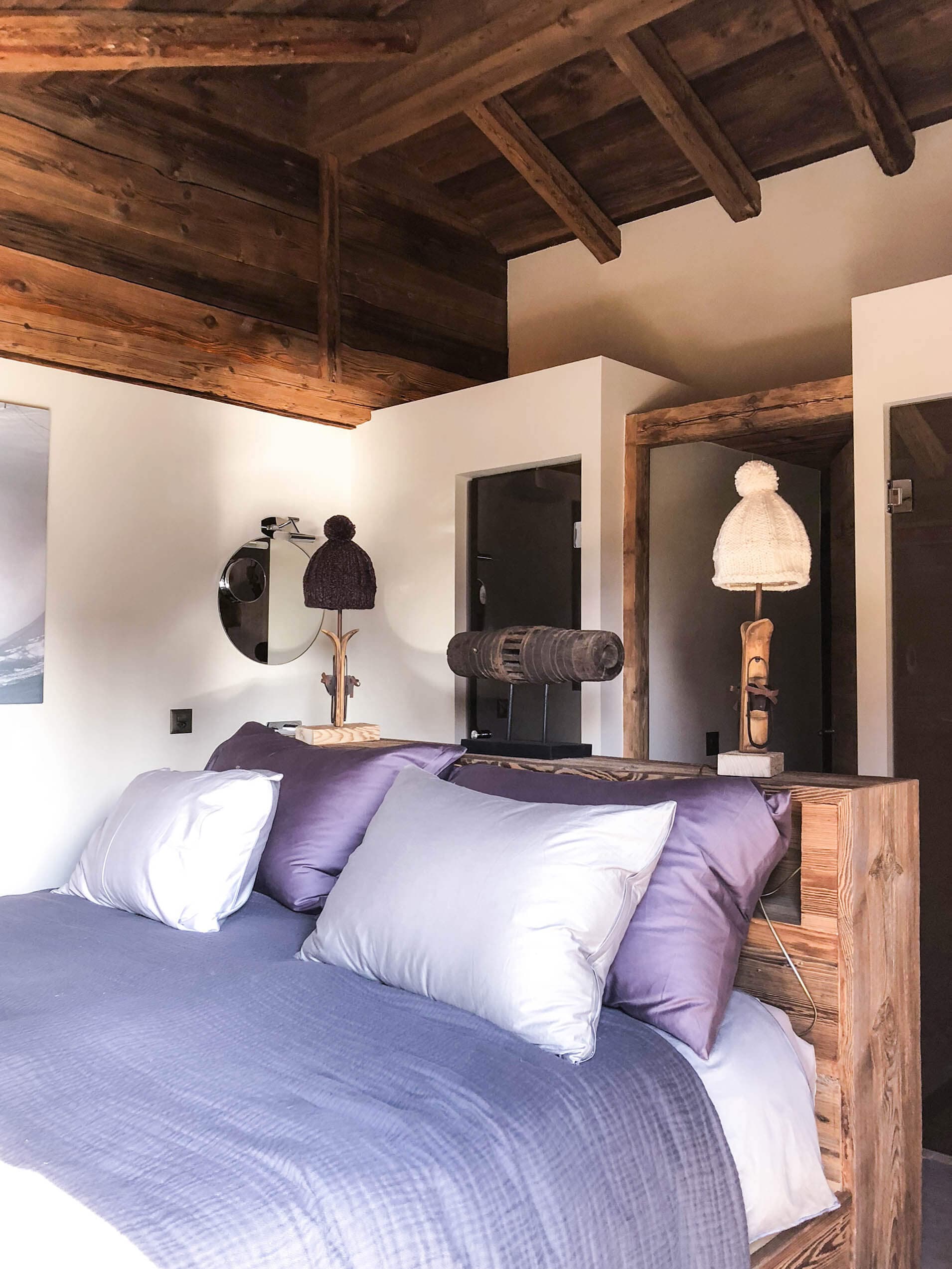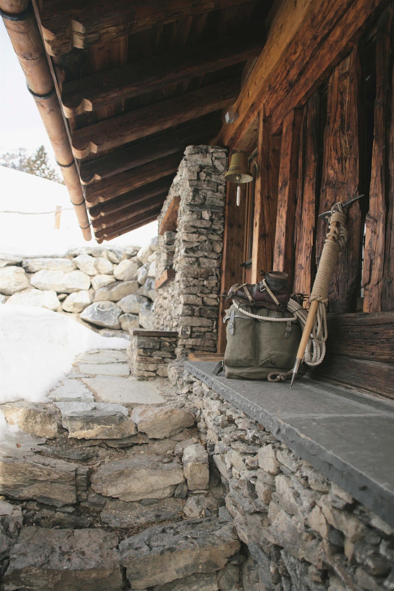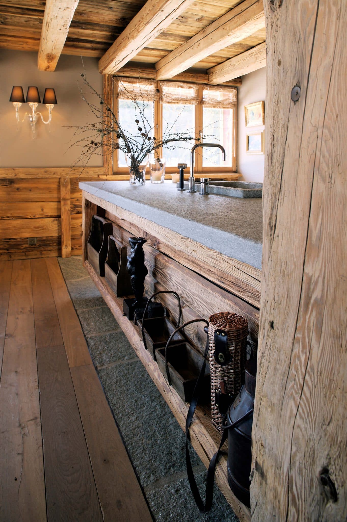 Chalet Heidi Le séjour s'organise autour d'une cheminée centrale à foyer ouvert sur socle en granite, encadrée d'une structure en vieux bois massif qui monte jusqu'à la mezzanine. La cuisine s'articule autour d'un long plan de travail en granite flammé porté par une structure en vieux bois brut, rangements ouverts en dessous. Dans les salles de bain, double vasque sur meuble en vieux bois à pieds bruts, plan en ardoise noire et colonne de baignoire taillée dans un rondin de bois brut sur lequel vient se fixer la robinetterie chromée. Sous le parquet du salon, une cave à vin entièrement visible à travers un plancher en verre, avec étagères en vieux bois sur fond de galets blancs.