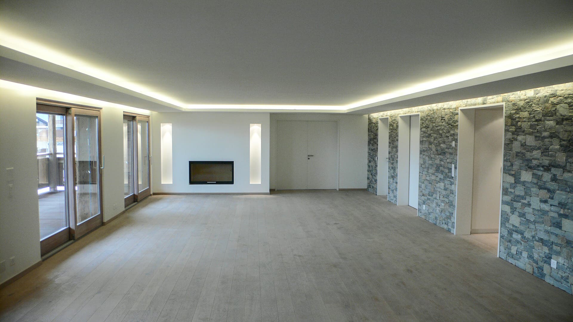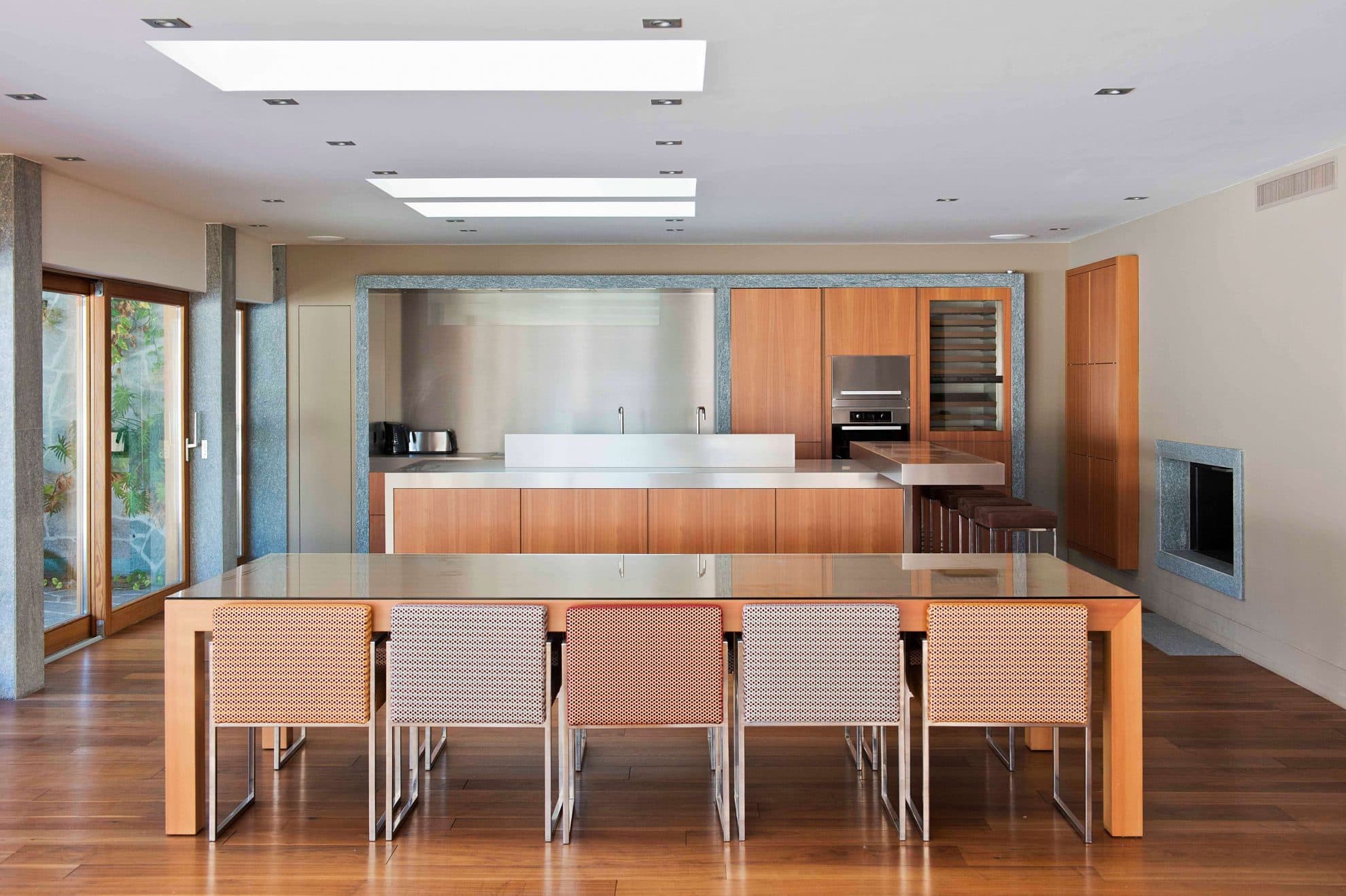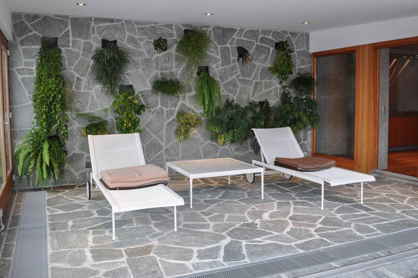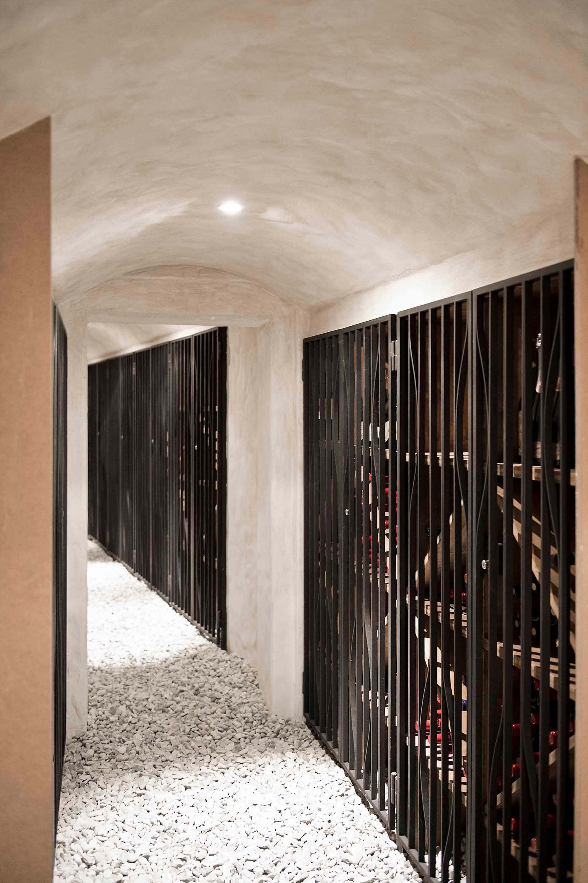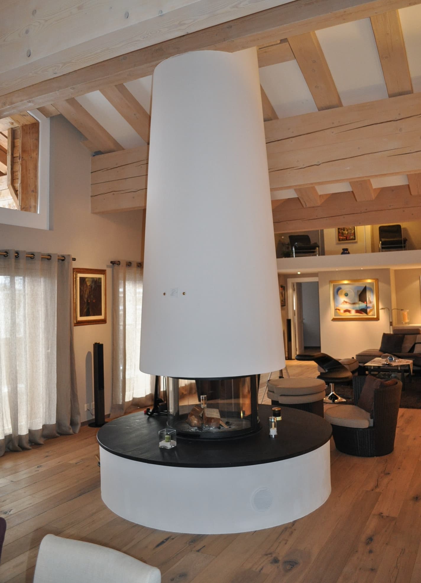 Immeuble Edelweiss Le séjour s'articule autour d'une cheminée centrale à foyer panoramique posée sur un socle cylindrique blanc, suspendue sous une hotte conique qui monte jusqu'à la charpente apparente en bois blanchi. Les volumes sont doubles hauteur, ouverts sur une mezzanine. La cuisine associe façades en bois chaud, plans de travail et crédence en inox, éclairée par deux grandes verrières zénithales. L'îlot central intègre un plan en inox avec vasque encastrée, face à une grande table de salle à manger en bois et métal. L'espace wellness s'organise autour d'un mur en pierre naturelle irrégulière habillé de végétaux, sol en dallage de granite brut et deux chaises longues blanches. En cave, un couloir voûté en enduit lisse blanc abrite des casiers à vin en fer forgé noir sur fond de galets blancs.